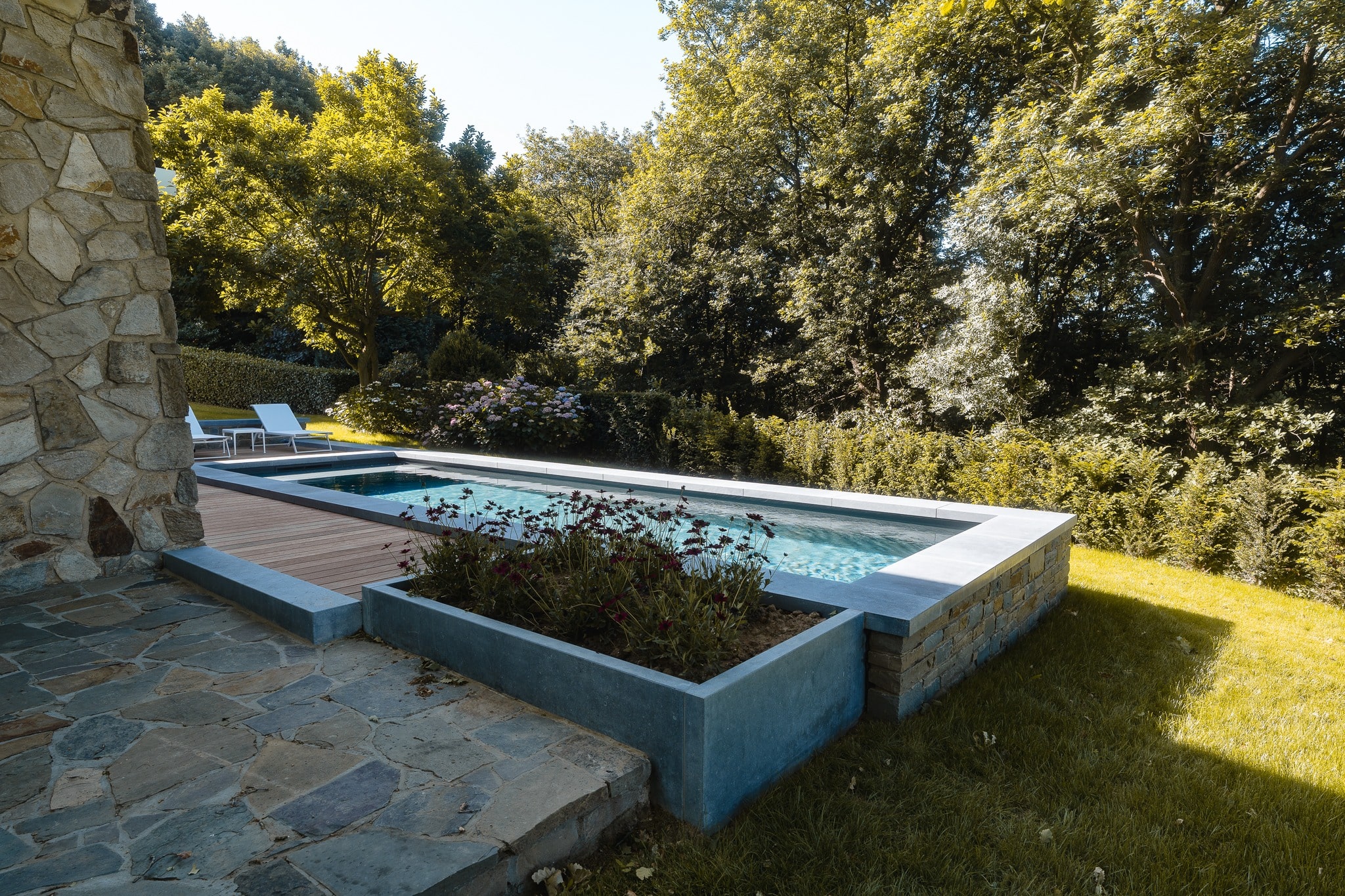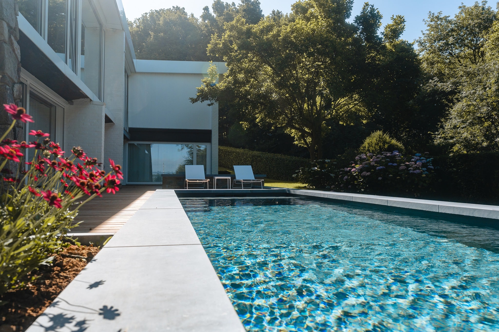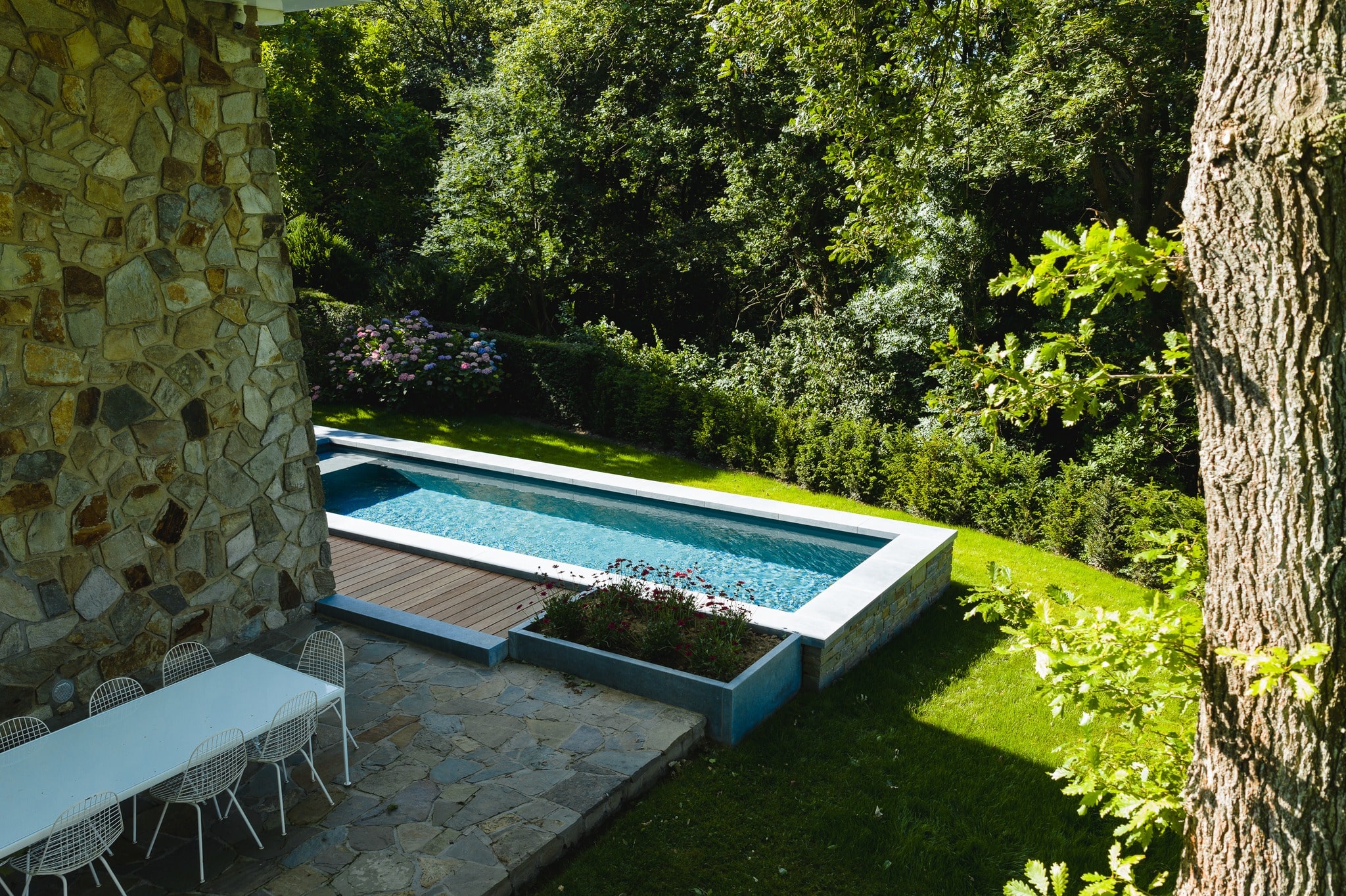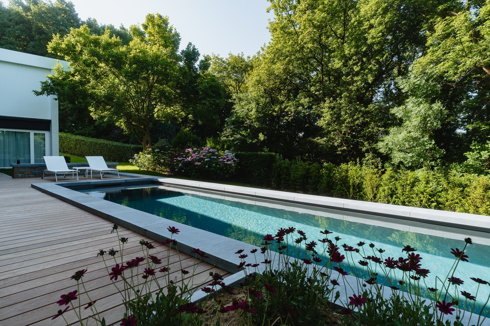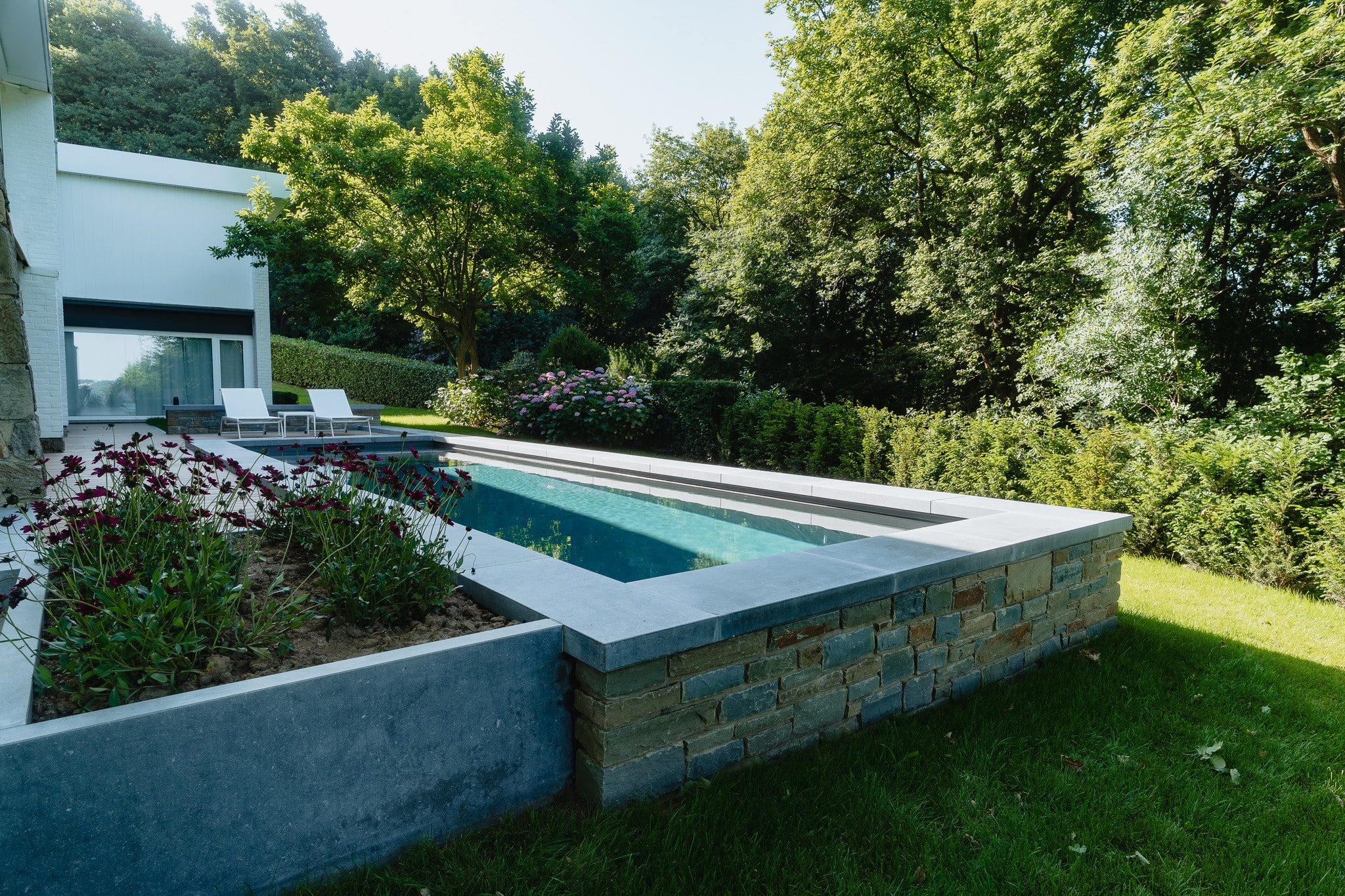 Réalisation d’une piscine à Beaufays, parfaitement intégrée à son environnement et en harmonie avec le caractère remarquable du jardin et des matériaux existants.