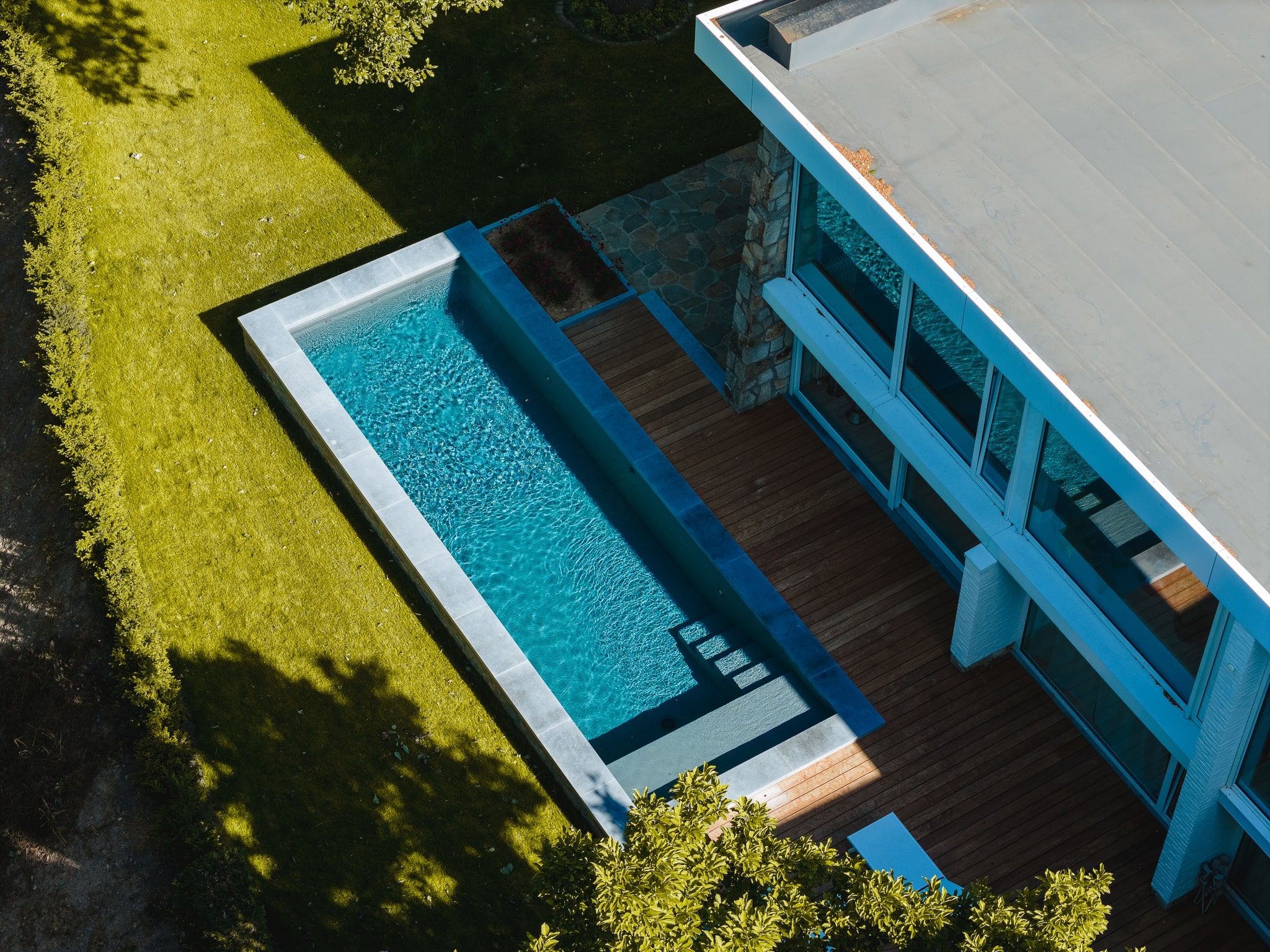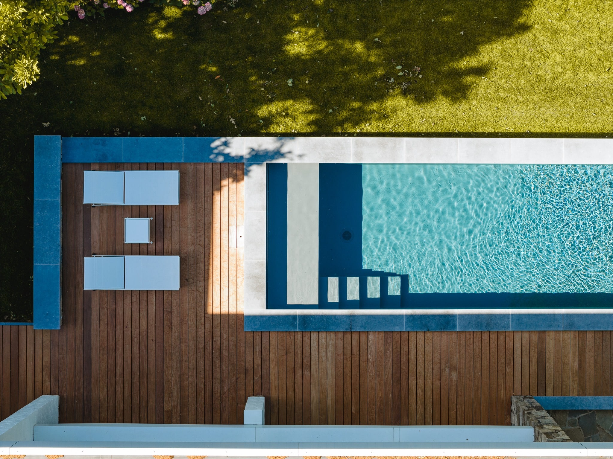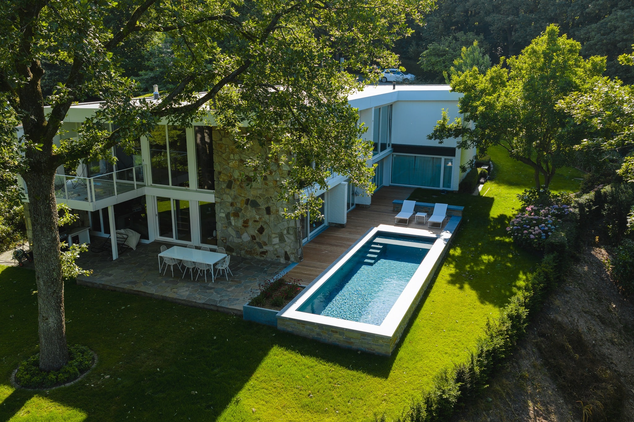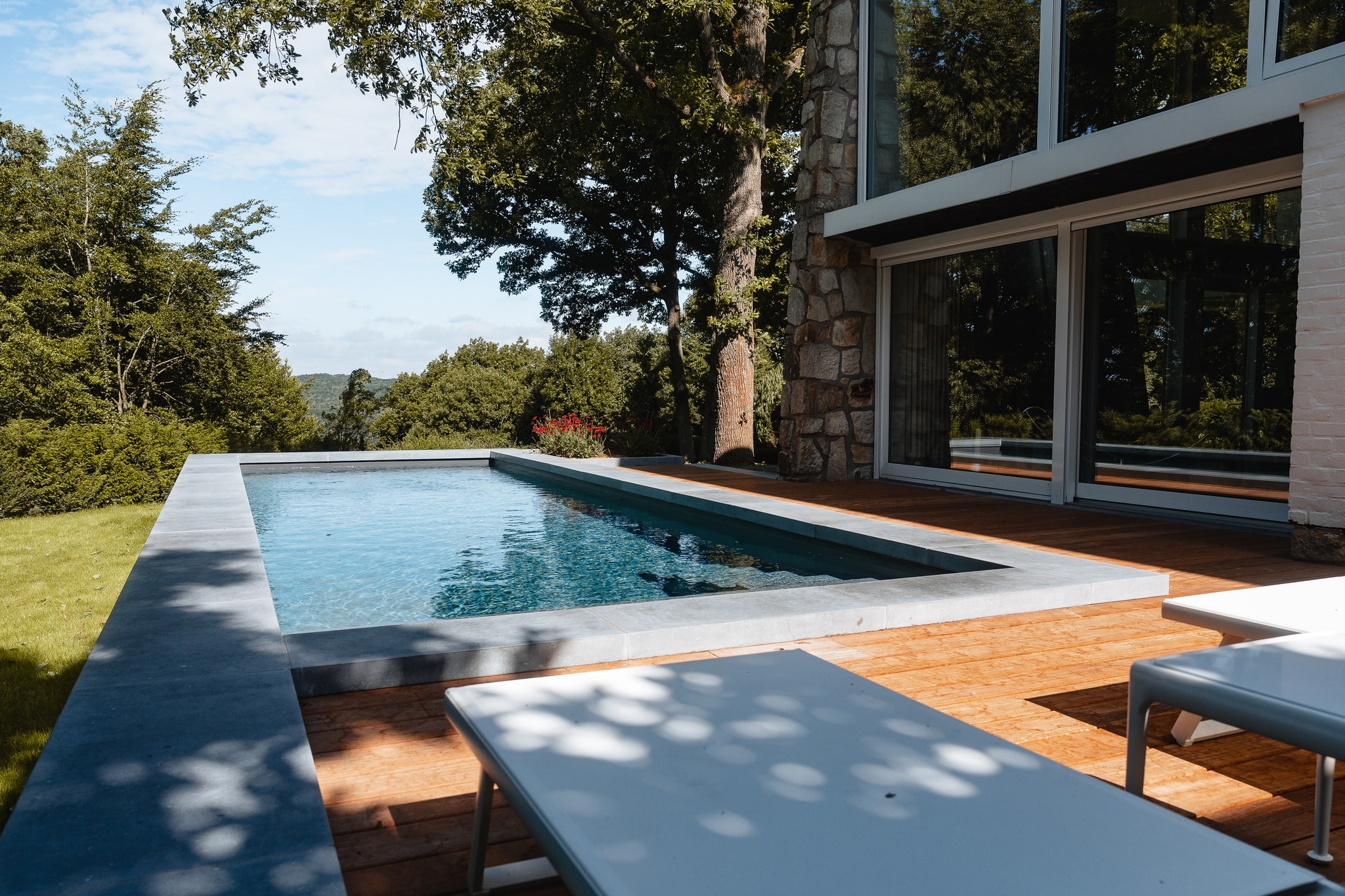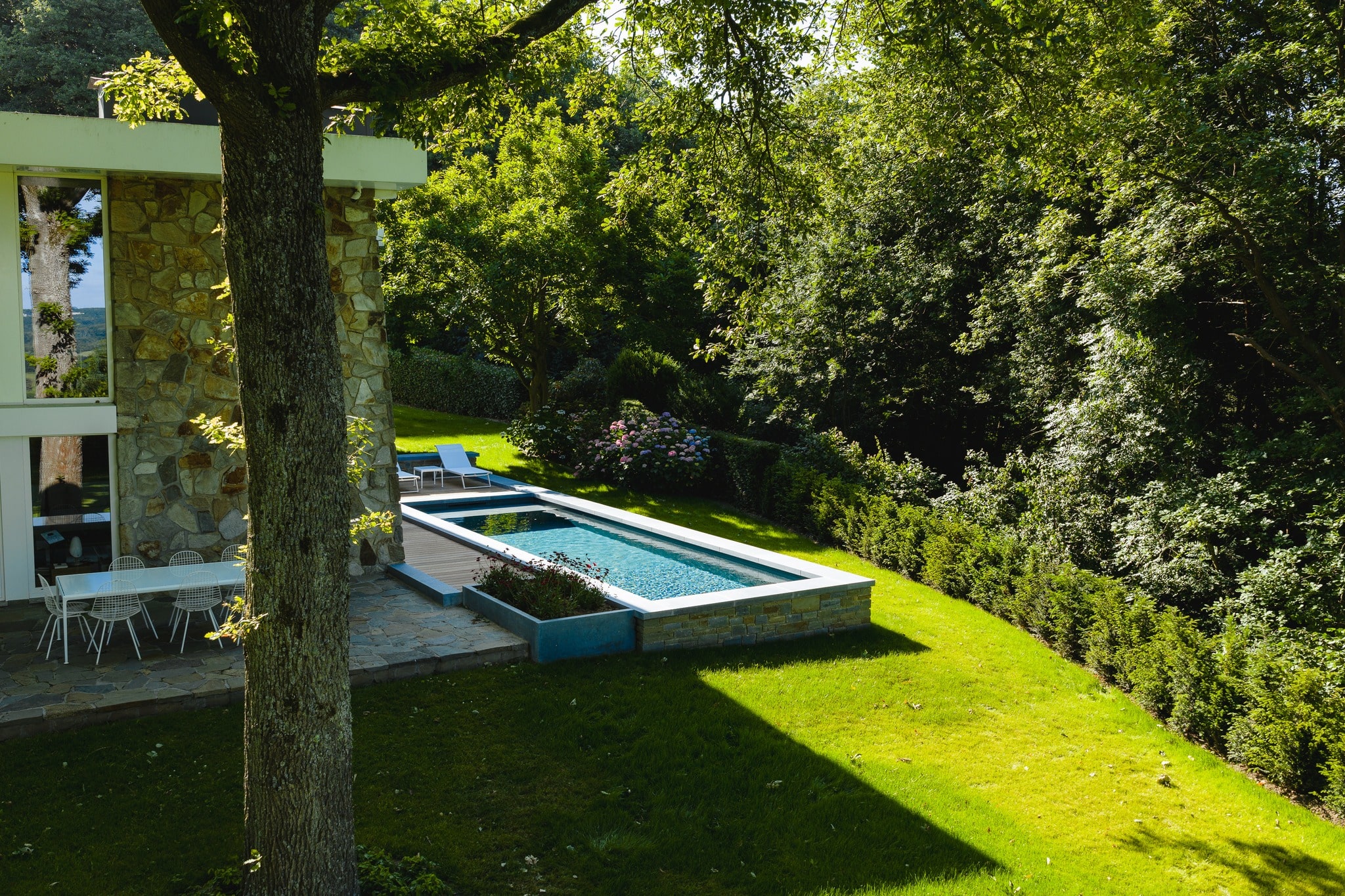 Réalisation d’une piscine à Beaufays, parfaitement intégrée à son environnement et en harmonie avec le caractère remarquable du jardin et des matériaux existants.